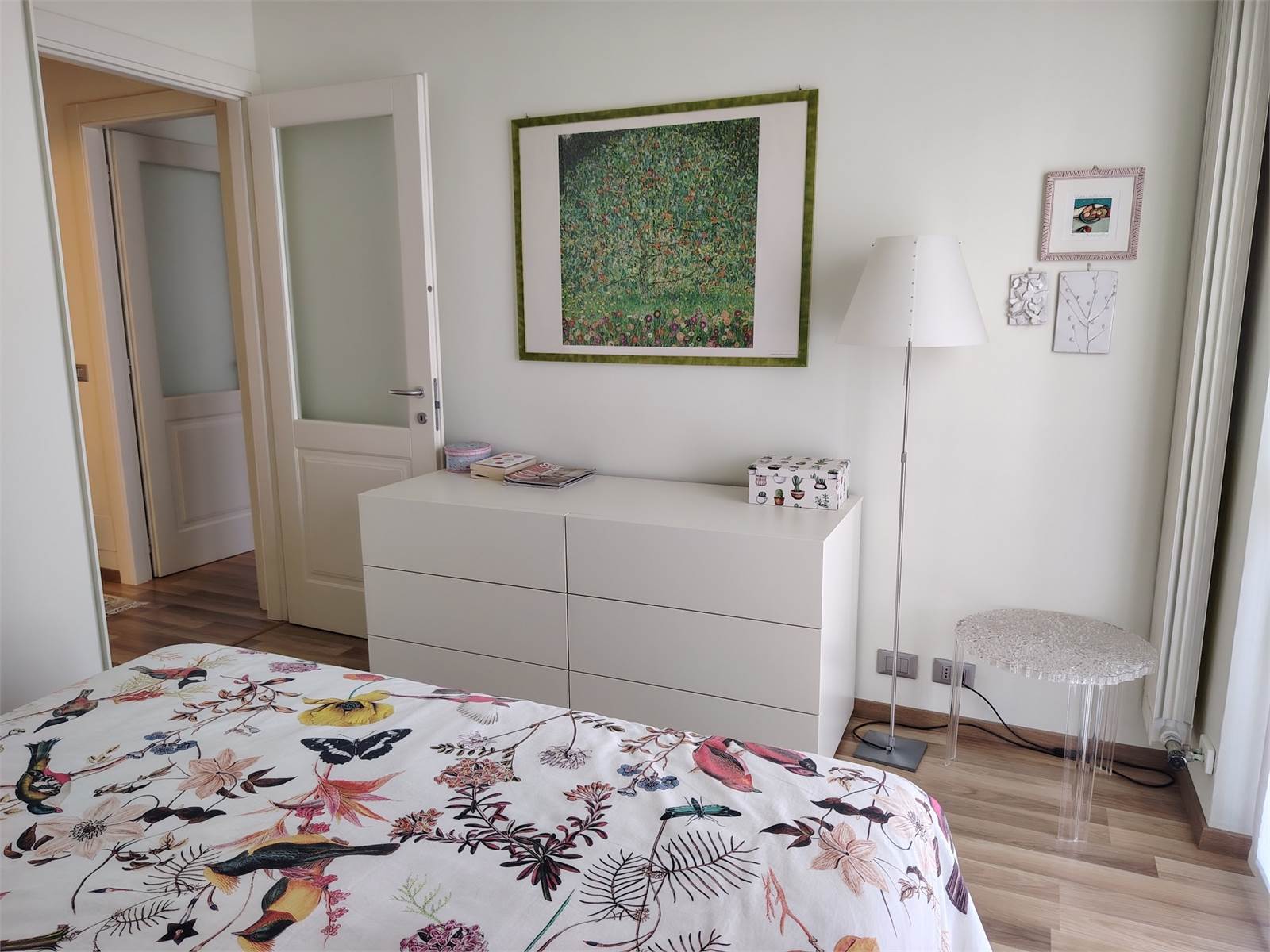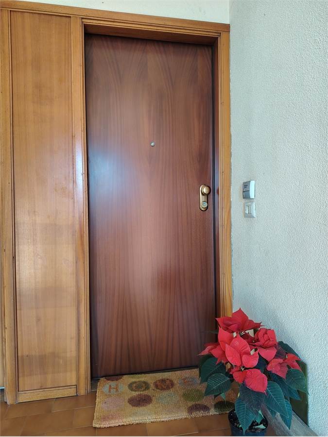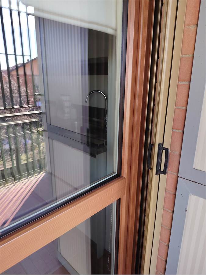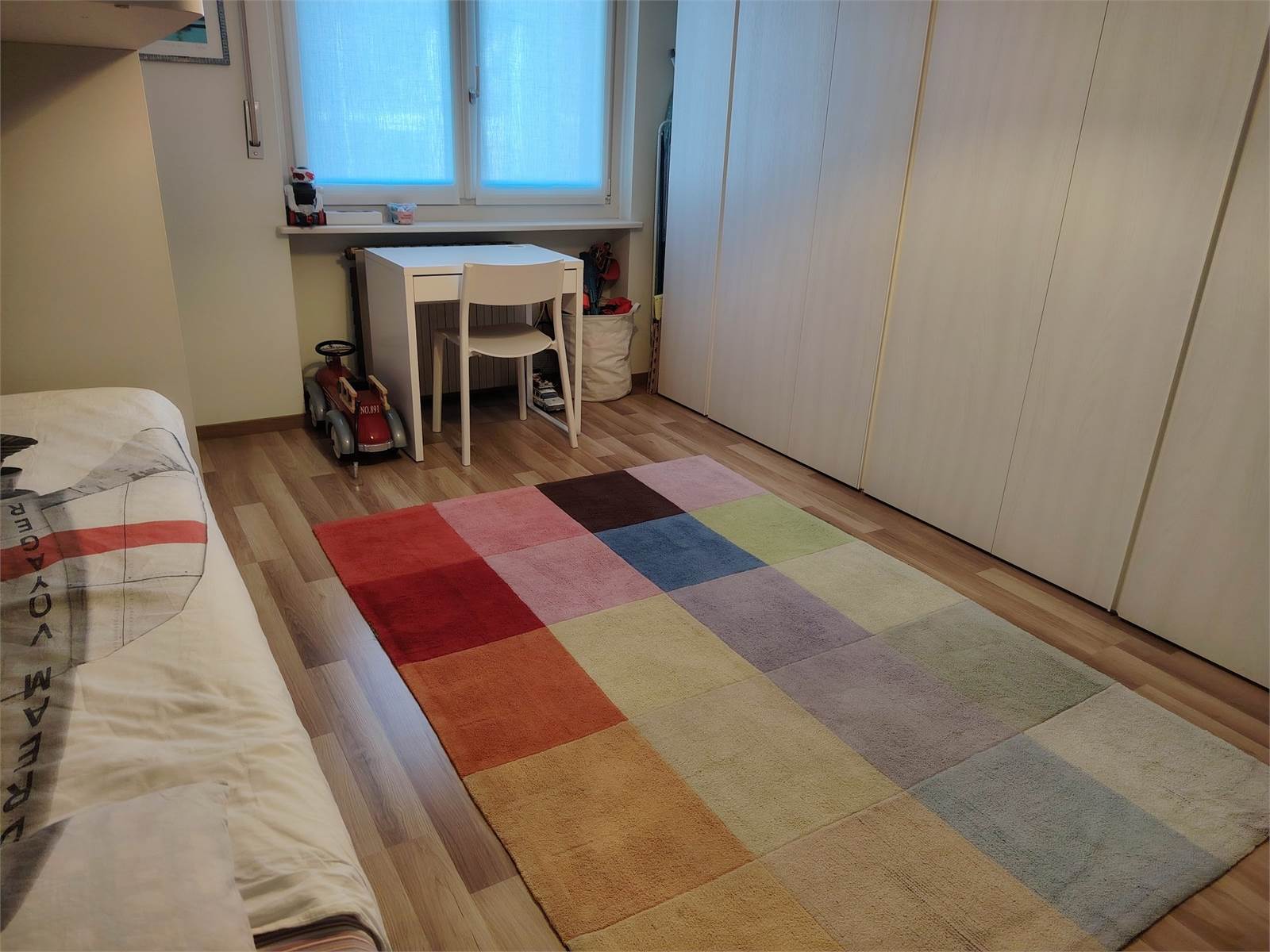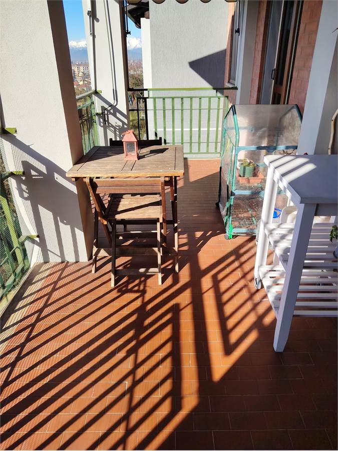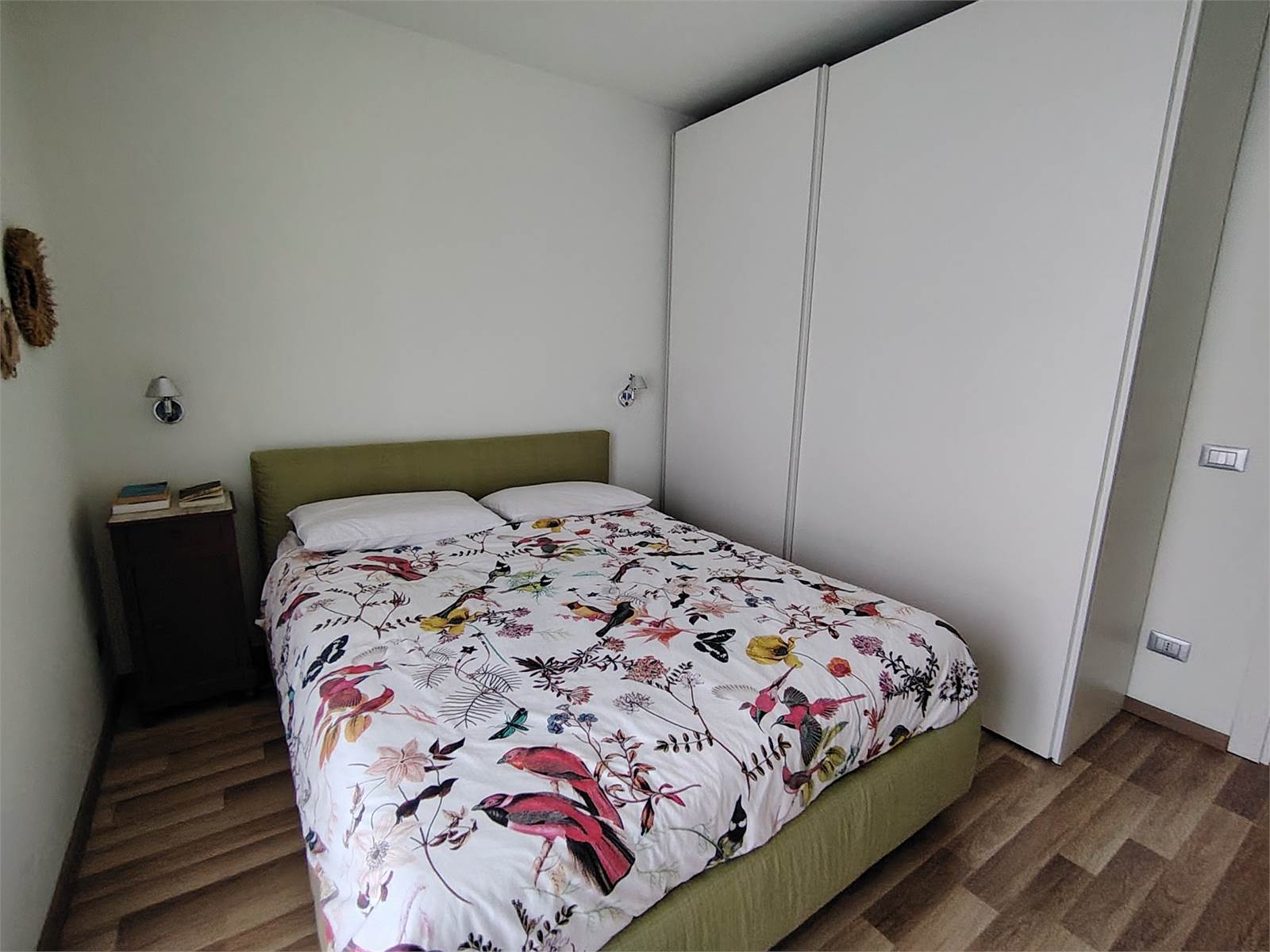 L'ingresso, che avviene tramite porta blindata, è direttamente sull'ampio soggiorno, molto luminoso grazie a finestra e porta finestra; quest'ultima introduce al terrazzino. Attigua si trova la cucina abitabile, anch'essa con porta finestra che conduce al terrazzo di cui sopra. Le camere da letto sono due; una singola con affaccio su un balcone e l'altra matrimoniale con finestra. I bagni ciechi sono due. Vi è inoltre un pratico e sempre utile ripostiglio. Il riscaldamento è autonomo con caldaia a condensazione. Gli infissi esterni sono in PVC con doppio vetro, tinta legno la parte esterna e color bianco quella interna; dispongono anche di zanzariere e di tapparelle metalliche. L'appartamento è completo di impianto di condizionamento che funziona anche come pompa di calore e di antifurto sia volumetrico che perimetrale. Elemento da evidenziare è lo splendido affaccio panoramico sull'arco alpino che si gode dal terrazzino, completo di tende da sole, sfruttabile ad esempio per organizzare cene all'aperto con gli amici o per godersi il relax della zona.