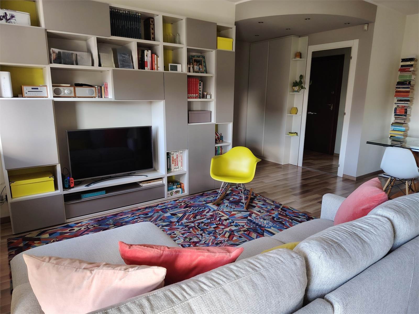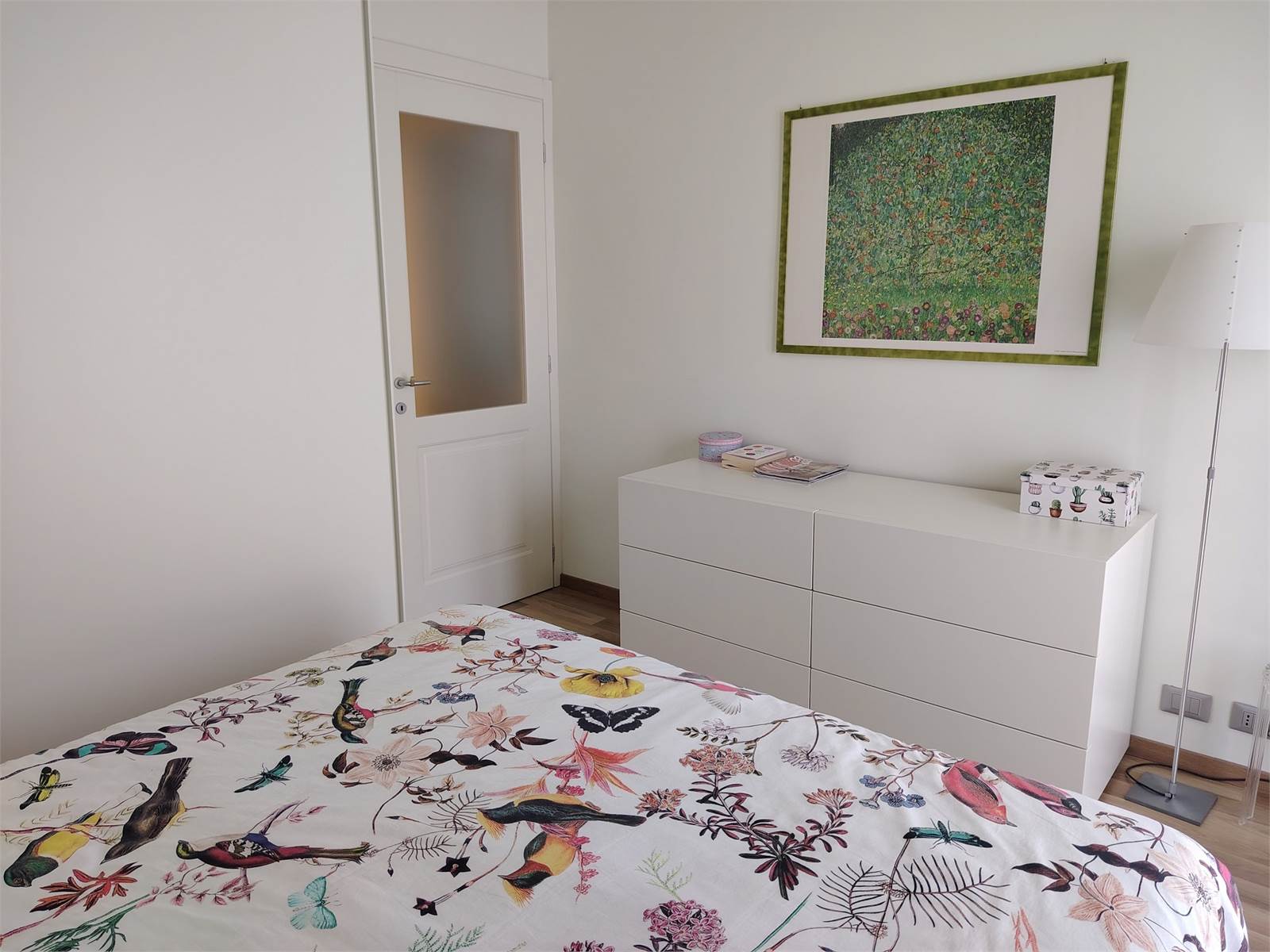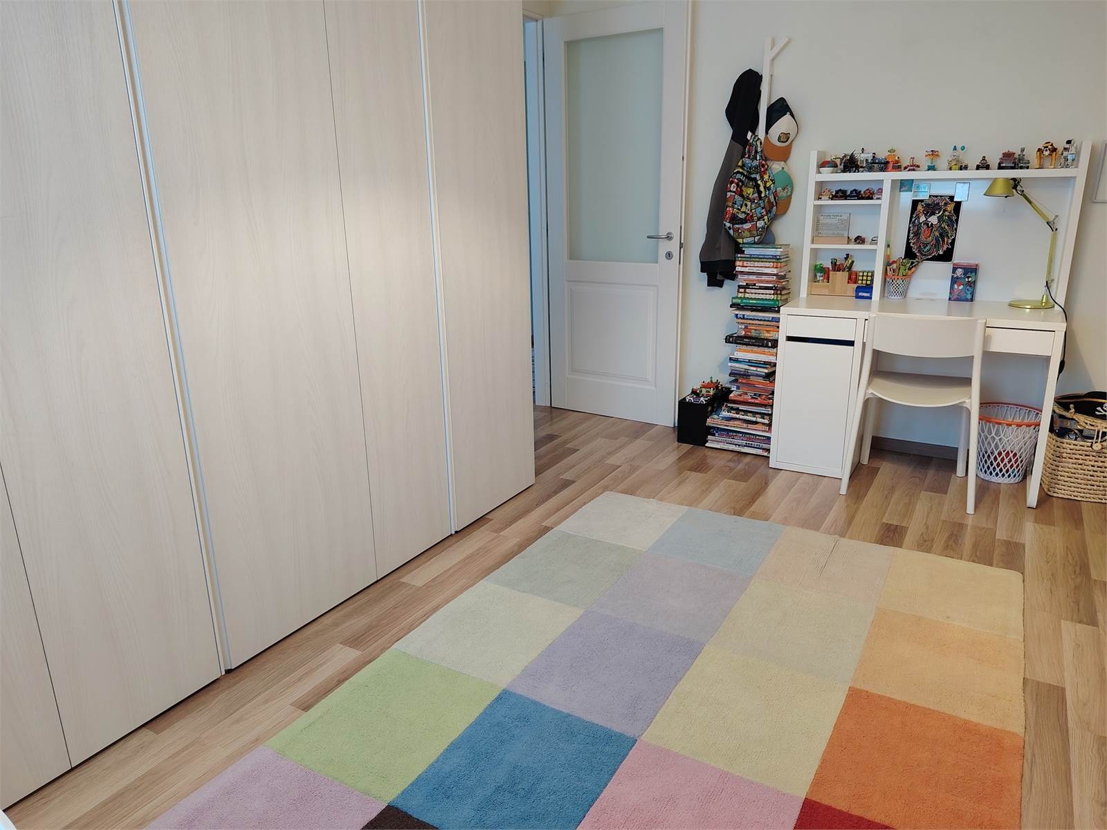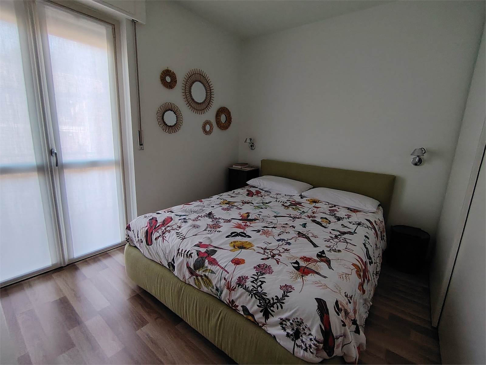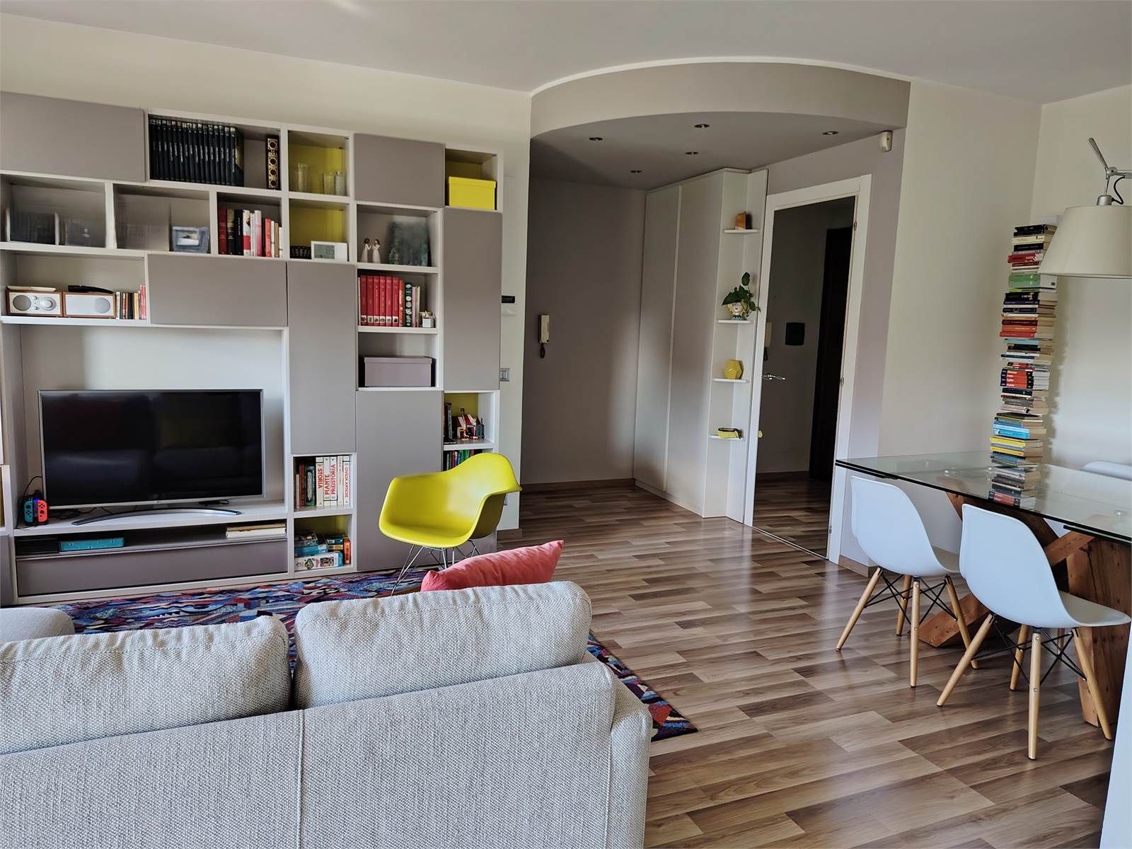 L'ingresso, che avviene tramite porta blindata, è direttamente sull'ampio soggiorno, molto luminoso grazie a finestra e porta finestra; quest'ultima introduce al terrazzino. Attigua si trova la cucina abitabile, anch'essa con porta finestra che conduce al terrazzo di cui sopra. Le camere da letto sono due; una singola con affaccio su un balcone e l'altra matrimoniale con finestra. I bagni ciechi sono due. Vi è inoltre un pratico e sempre utile ripostiglio. Il riscaldamento è autonomo con caldaia a condensazione. Gli infissi esterni sono in PVC con doppio vetro, tinta legno la parte esterna e color bianco quella interna; dispongono anche di zanzariere e di tapparelle metalliche. L'appartamento è completo di impianto di condizionamento che funziona anche come pompa di calore e di antifurto sia volumetrico che perimetrale. Elemento da evidenziare è lo splendido affaccio panoramico sull'arco alpino che si gode dal terrazzino, completo di tende da sole, sfruttabile ad esempio per organizzare cene all'aperto con gli amici o per godersi il relax della zona.