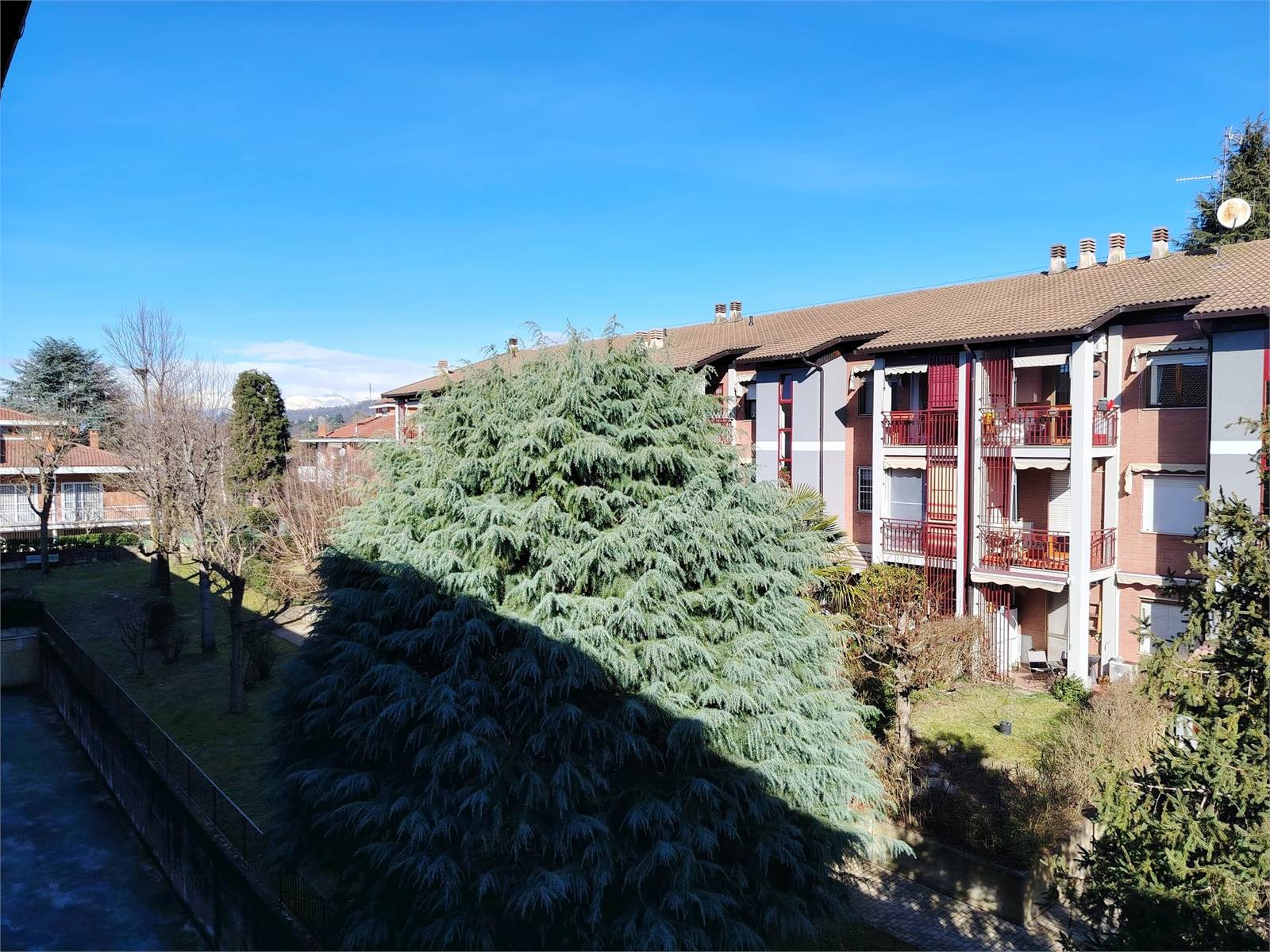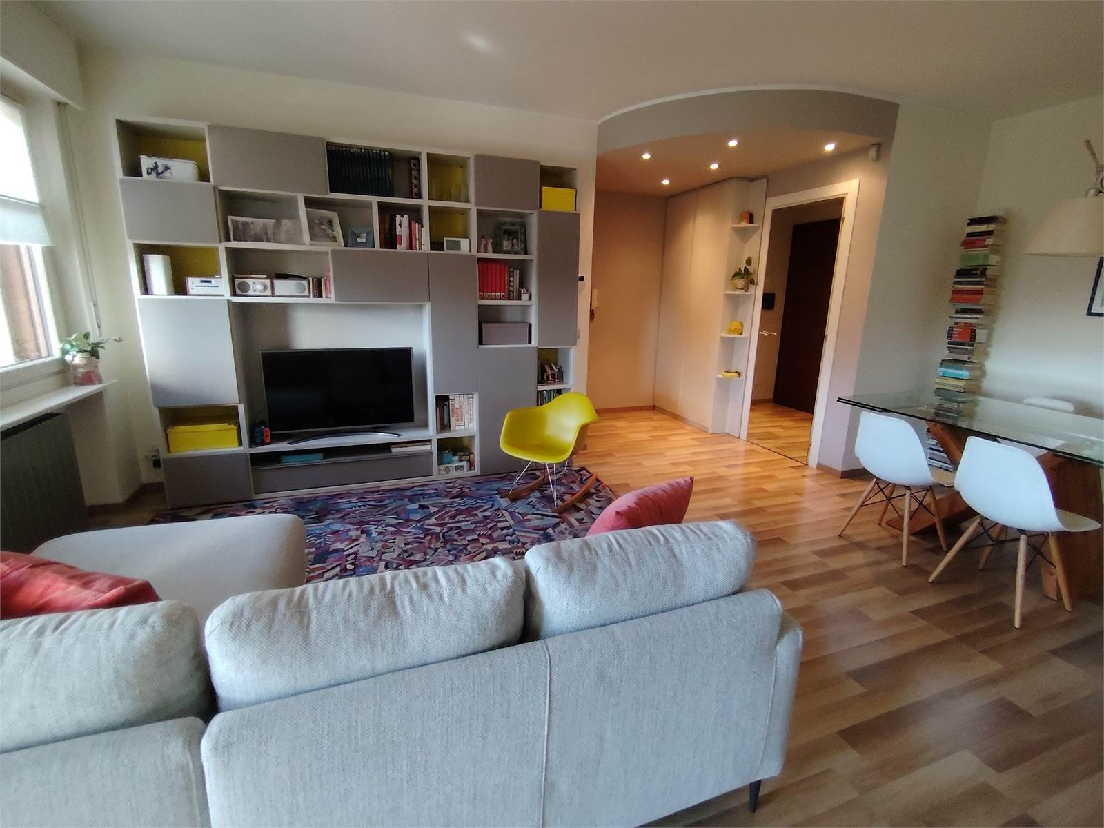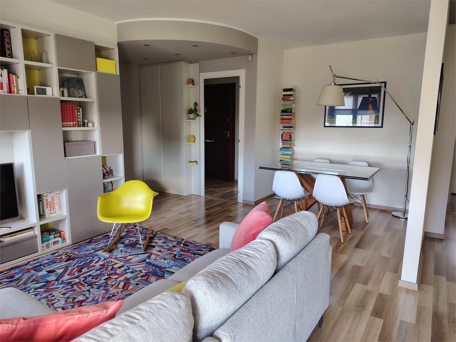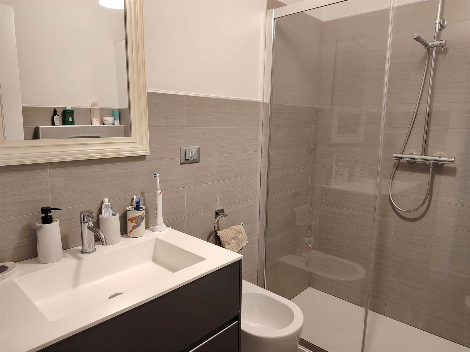 L'ingresso, che avviene tramite porta blindata, è direttamente sull'ampio soggiorno, molto luminoso grazie a finestra e porta finestra; quest'ultima introduce al terrazzino. Attigua si trova la cucina abitabile, anch'essa con porta finestra che conduce al terrazzo di cui sopra. Le camere da letto sono due; una singola con affaccio su un balcone e l'altra matrimoniale con finestra. I bagni ciechi sono due. Vi è inoltre un pratico e sempre utile ripostiglio. Il riscaldamento è autonomo con caldaia a condensazione. Gli infissi esterni sono in PVC con doppio vetro, tinta legno la parte esterna e color bianco quella interna; dispongono anche di zanzariere e di tapparelle metalliche. L'appartamento è completo di impianto di condizionamento che funziona anche come pompa di calore e di antifurto sia volumetrico che perimetrale. Elemento da evidenziare è lo splendido affaccio panoramico sull'arco alpino che si gode dal terrazzino, completo di tende da sole, sfruttabile ad esempio per organizzare cene all'aperto con gli amici o per godersi il relax della zona.