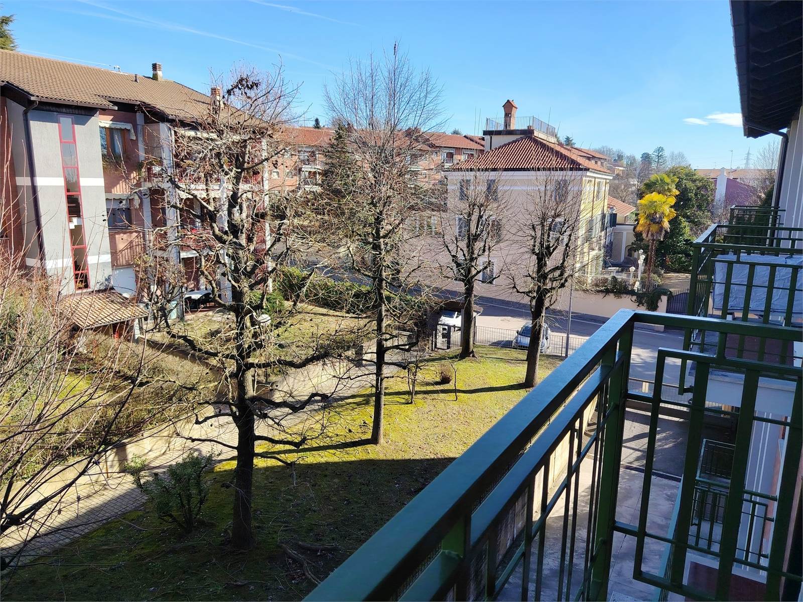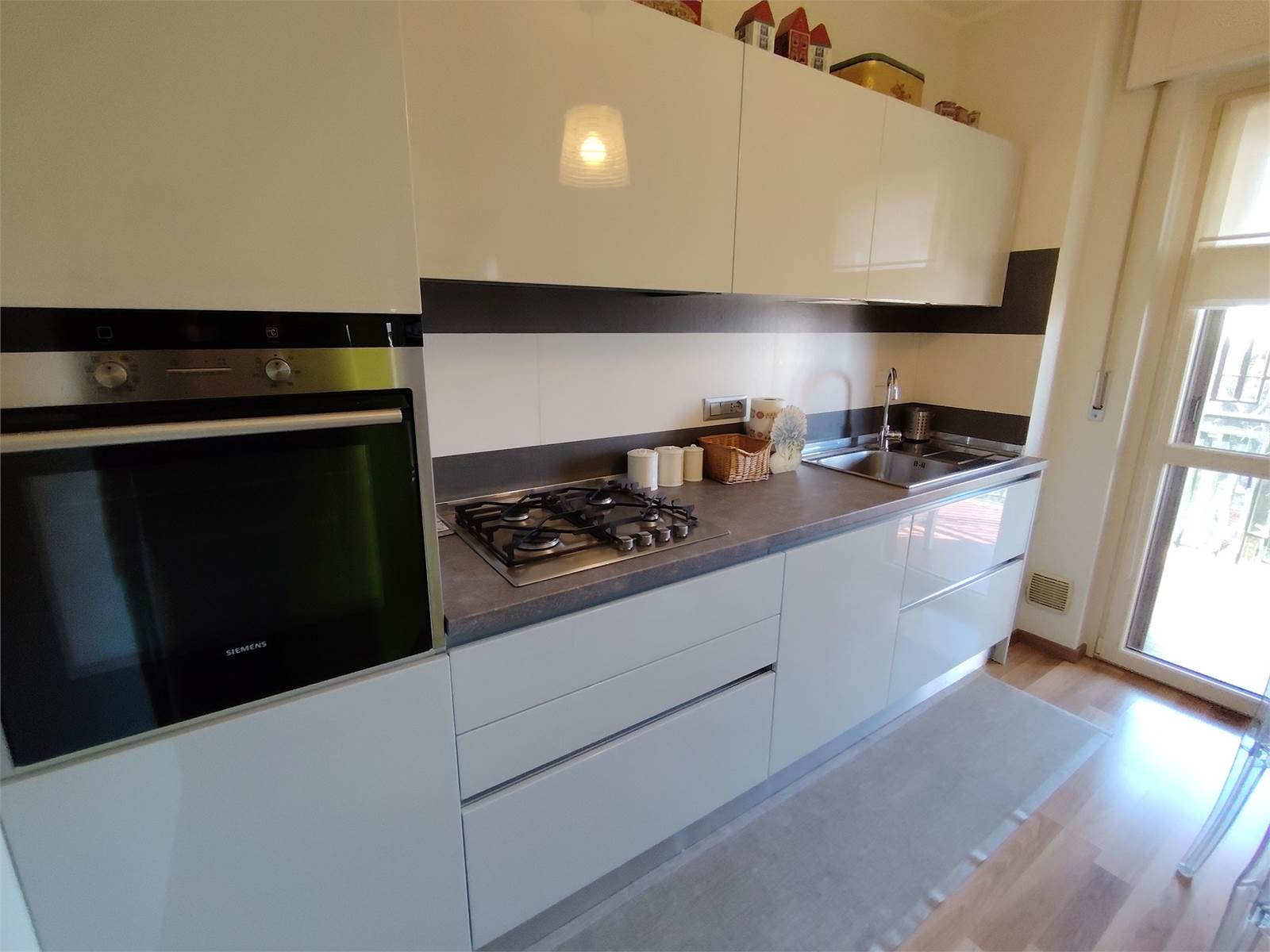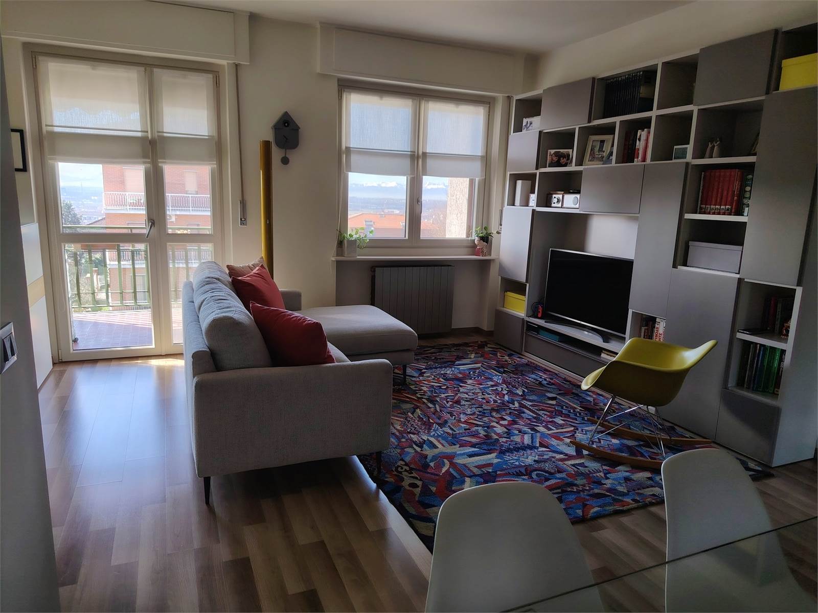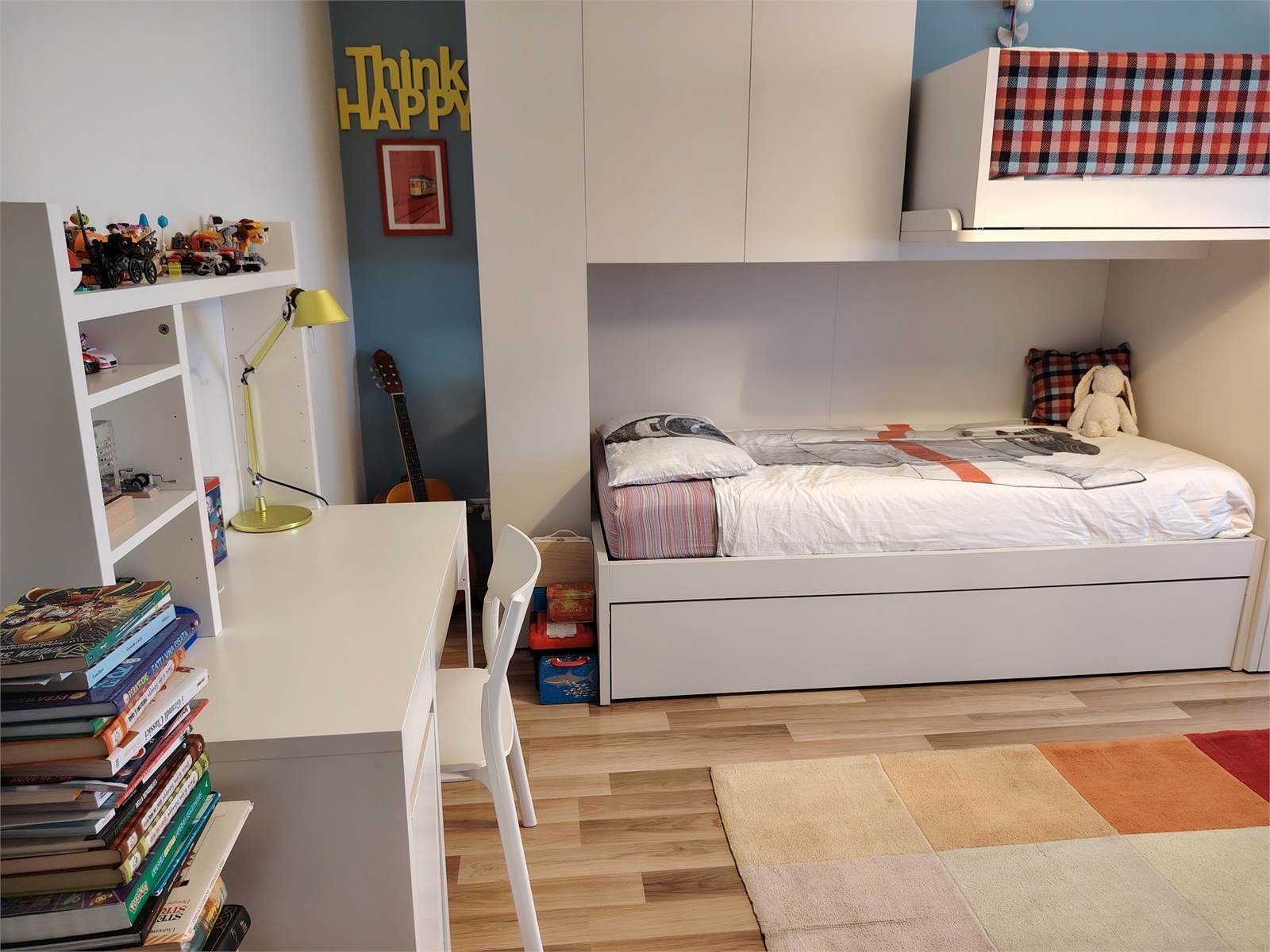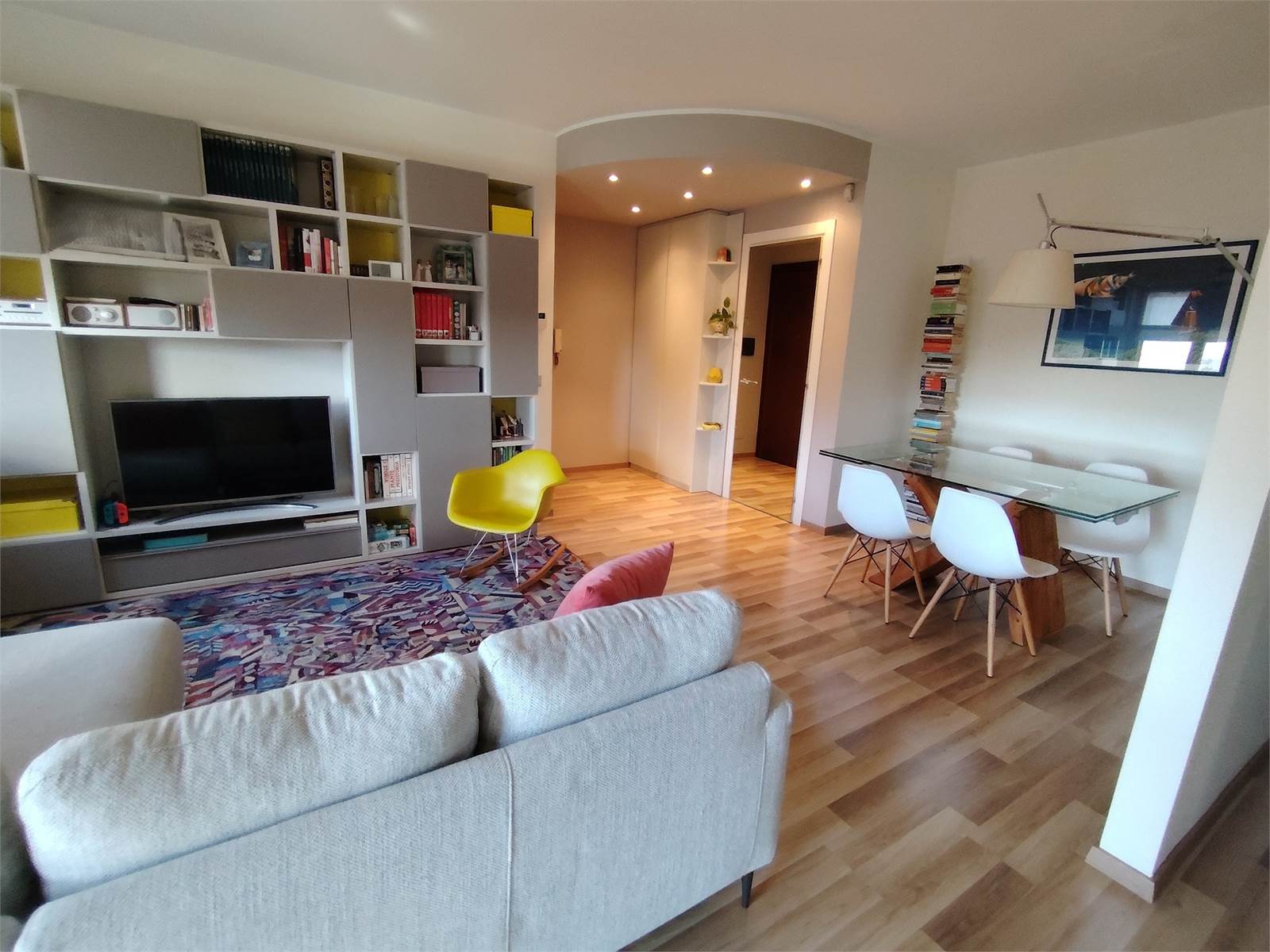 L'ingresso, che avviene tramite porta blindata, è direttamente sull'ampio soggiorno, molto luminoso grazie a finestra e porta finestra; quest'ultima introduce al terrazzino. Attigua si trova la cucina abitabile, anch'essa con porta finestra che conduce al terrazzo di cui sopra. Le camere da letto sono due; una singola con affaccio su un balcone e l'altra matrimoniale con finestra. I bagni ciechi sono due. Vi è inoltre un pratico e sempre utile ripostiglio. Il riscaldamento è autonomo con caldaia a condensazione. Gli infissi esterni sono in PVC con doppio vetro, tinta legno la parte esterna e color bianco quella interna; dispongono anche di zanzariere e di tapparelle metalliche. L'appartamento è completo di impianto di condizionamento che funziona anche come pompa di calore e di antifurto sia volumetrico che perimetrale. Elemento da evidenziare è lo splendido affaccio panoramico sull'arco alpino che si gode dal terrazzino, completo di tende da sole, sfruttabile ad esempio per organizzare cene all'aperto con gli amici o per godersi il relax della zona.