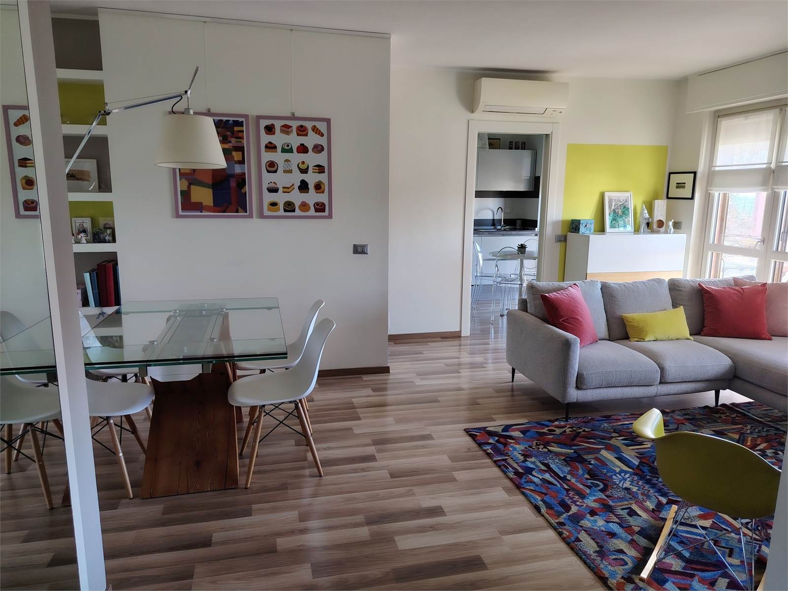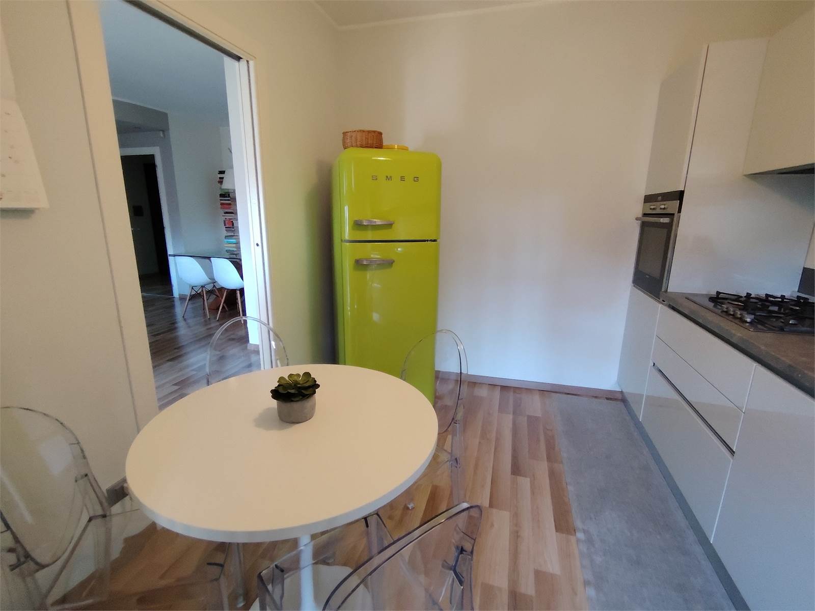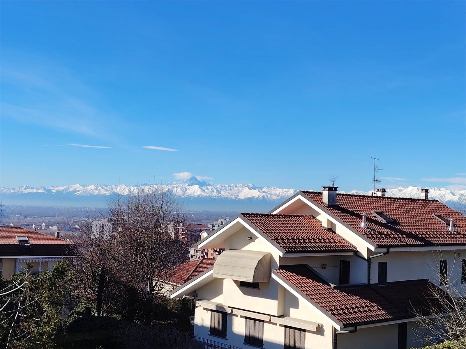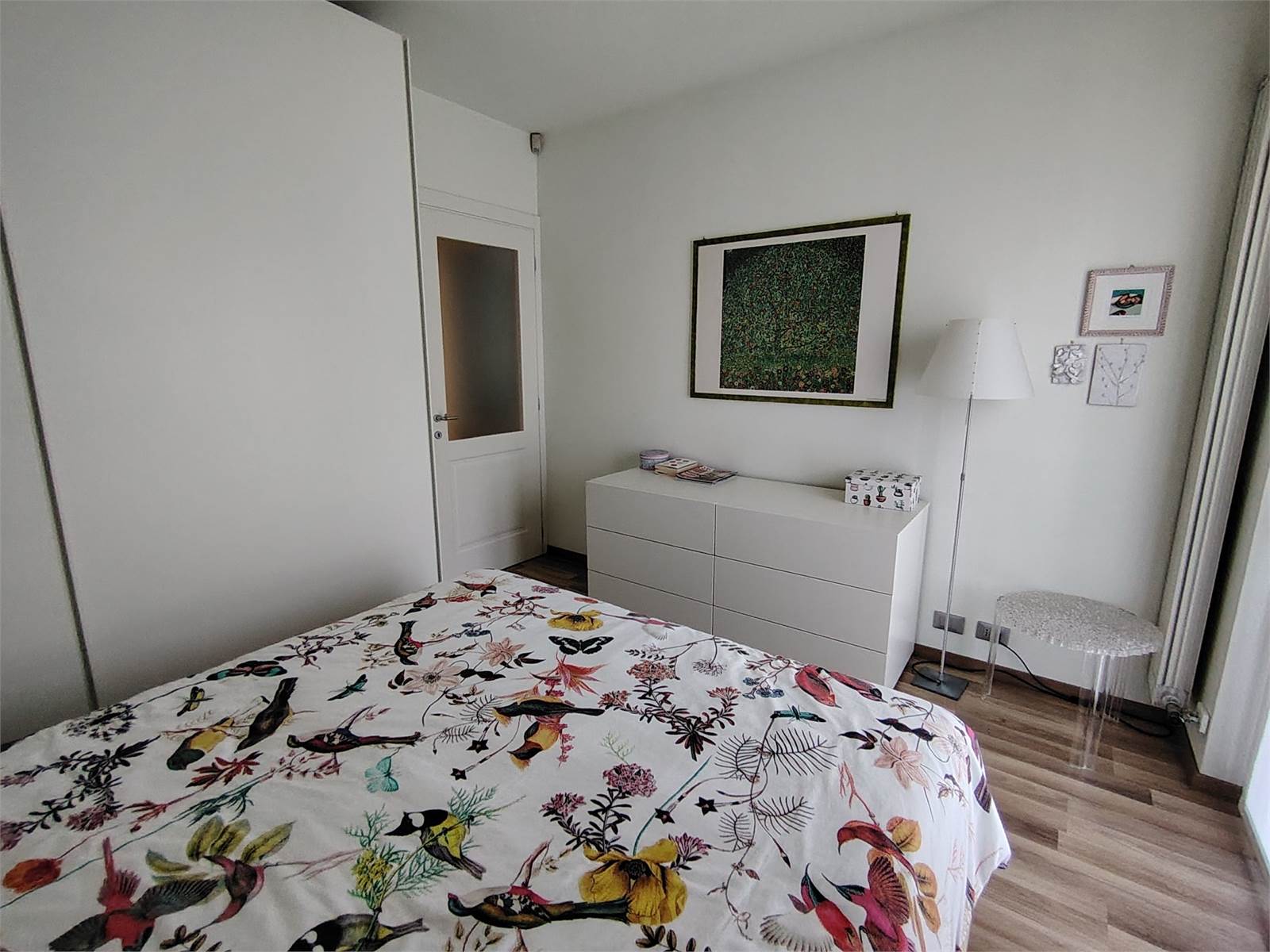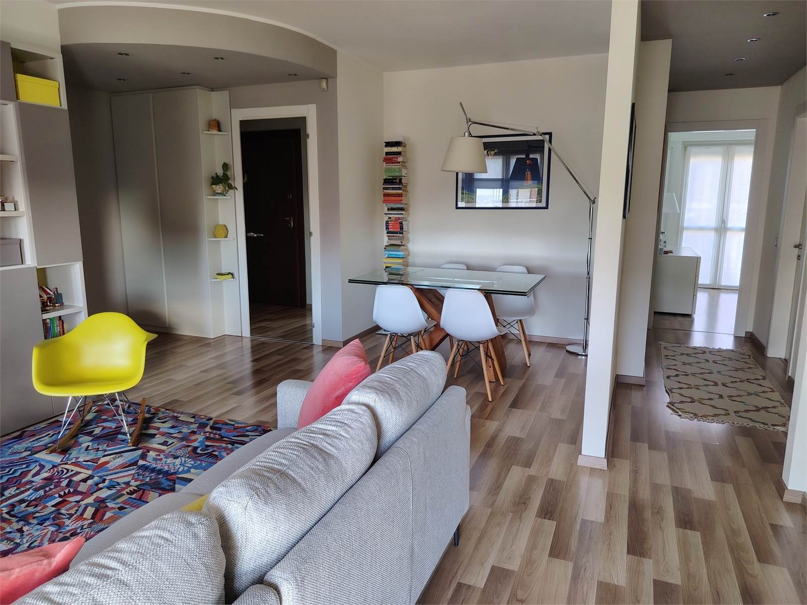 L'ingresso, che avviene tramite porta blindata, è direttamente sull'ampio soggiorno, molto luminoso grazie a finestra e porta finestra; quest'ultima introduce al terrazzino. Attigua si trova la cucina abitabile, anch'essa con porta finestra che conduce al terrazzo di cui sopra. Le camere da letto sono due; una singola con affaccio su un balcone e l'altra matrimoniale con finestra. I bagni ciechi sono due. Vi è inoltre un pratico e sempre utile ripostiglio. Il riscaldamento è autonomo con caldaia a condensazione. Gli infissi esterni sono in PVC con doppio vetro, tinta legno la parte esterna e color bianco quella interna; dispongono anche di zanzariere e di tapparelle metalliche. L'appartamento è completo di impianto di condizionamento che funziona anche come pompa di calore e di antifurto sia volumetrico che perimetrale. Elemento da evidenziare è lo splendido affaccio panoramico sull'arco alpino che si gode dal terrazzino, completo di tende da sole, sfruttabile ad esempio per organizzare cene all'aperto con gli amici o per godersi il relax della zona.