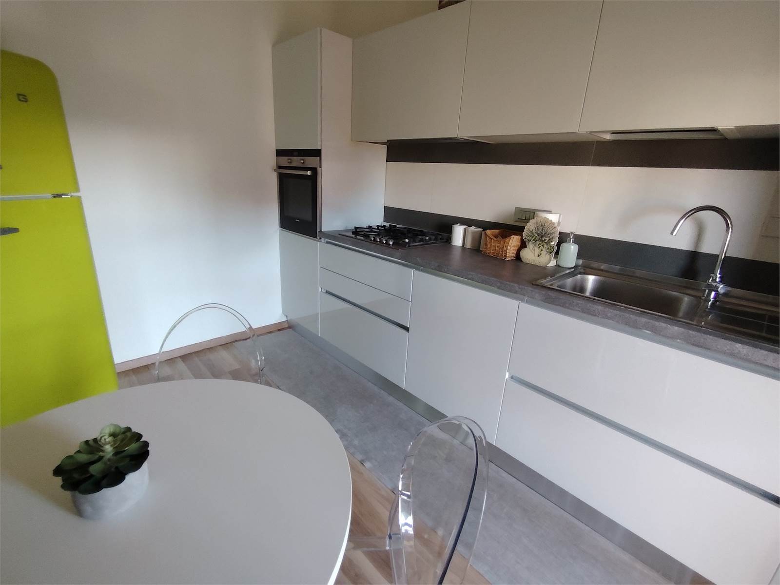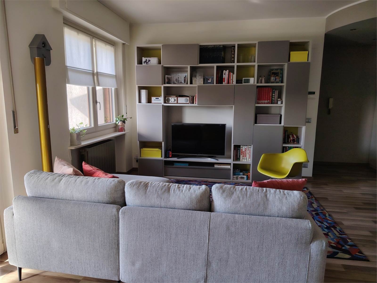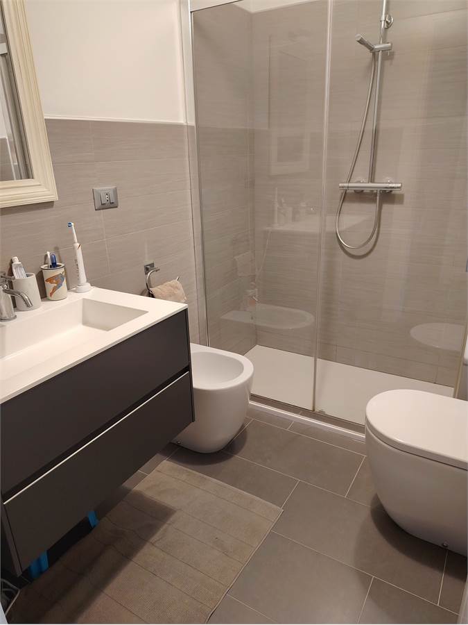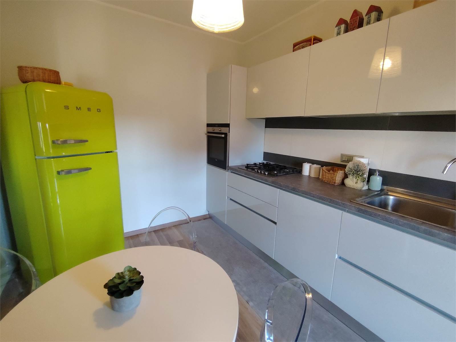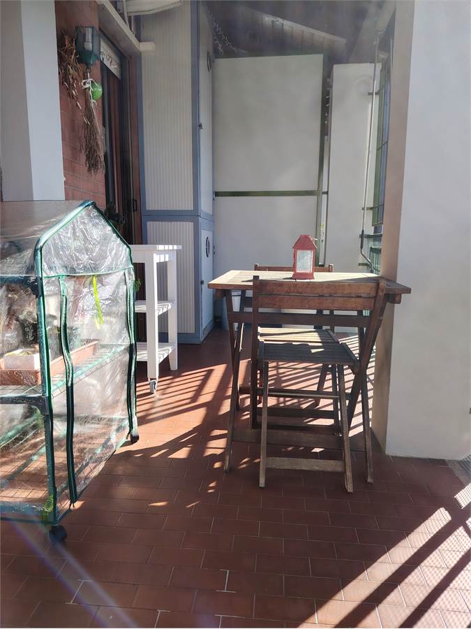 L'ingresso, che avviene tramite porta blindata, è direttamente sull'ampio soggiorno, molto luminoso grazie a finestra e porta finestra; quest'ultima introduce al terrazzino. Attigua si trova la cucina abitabile, anch'essa con porta finestra che conduce al terrazzo di cui sopra. Le camere da letto sono due; una singola con affaccio su un balcone e l'altra matrimoniale con finestra. I bagni ciechi sono due. Vi è inoltre un pratico e sempre utile ripostiglio. Il riscaldamento è autonomo con caldaia a condensazione. Gli infissi esterni sono in PVC con doppio vetro, tinta legno la parte esterna e color bianco quella interna; dispongono anche di zanzariere e di tapparelle metalliche. L'appartamento è completo di impianto di condizionamento che funziona anche come pompa di calore e di antifurto sia volumetrico che perimetrale. Elemento da evidenziare è lo splendido affaccio panoramico sull'arco alpino che si gode dal terrazzino, completo di tende da sole, sfruttabile ad esempio per organizzare cene all'aperto con gli amici o per godersi il relax della zona.