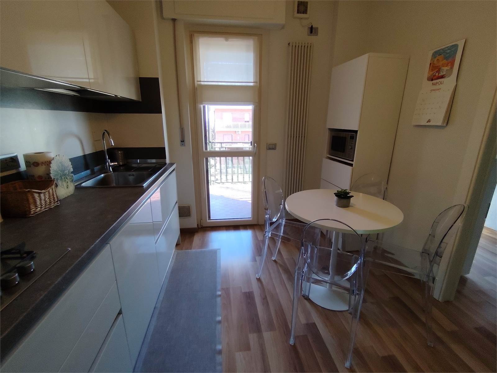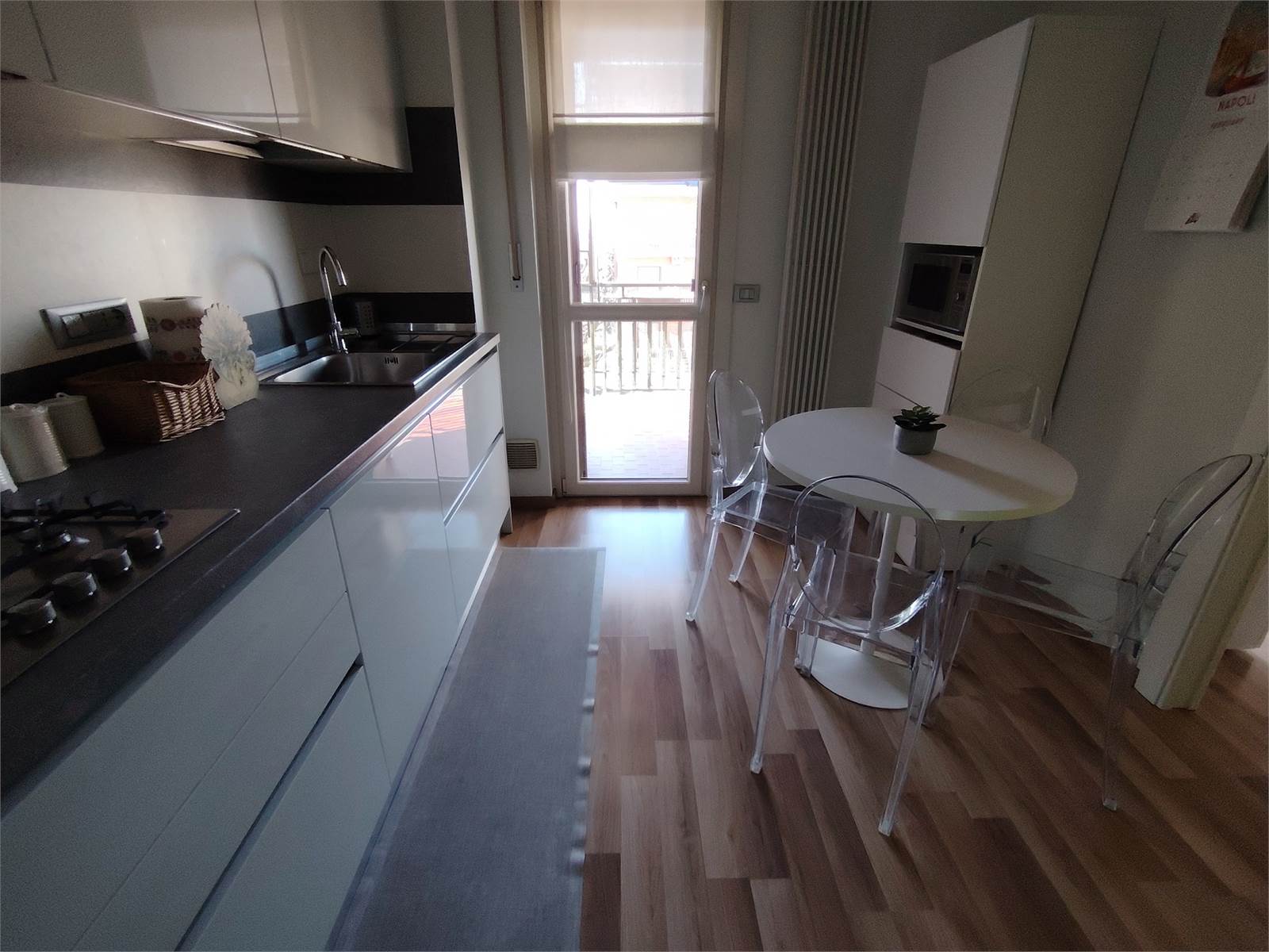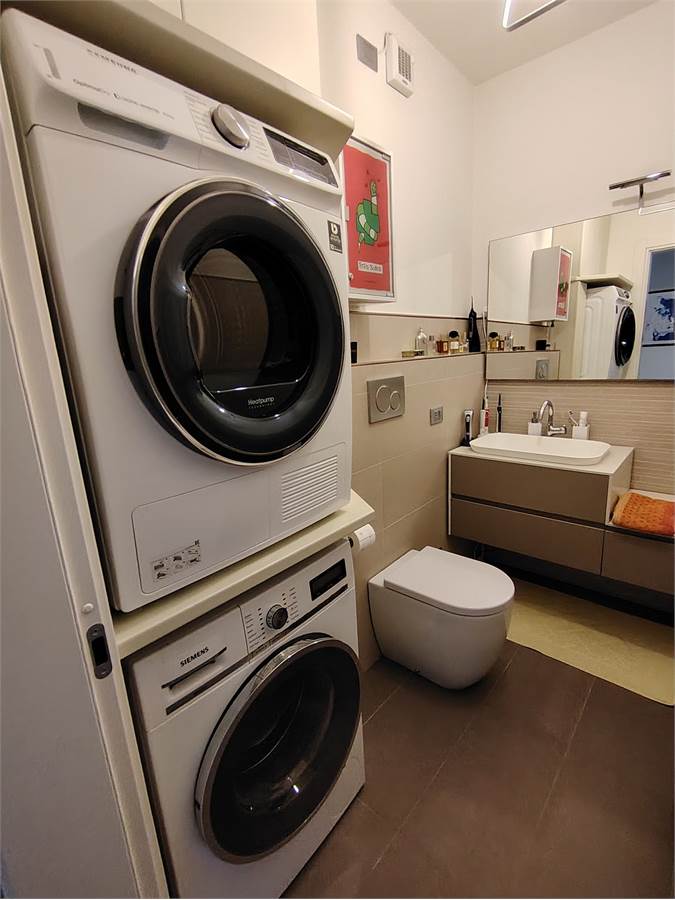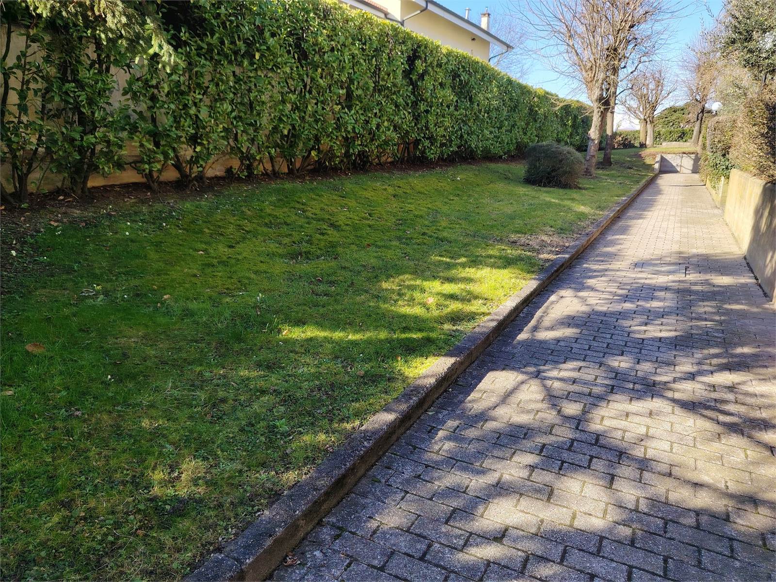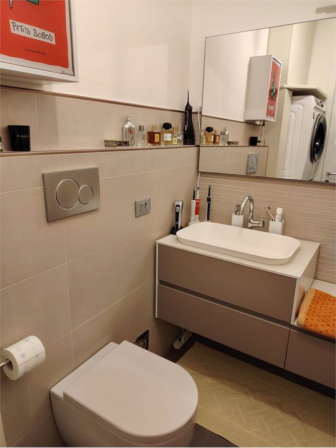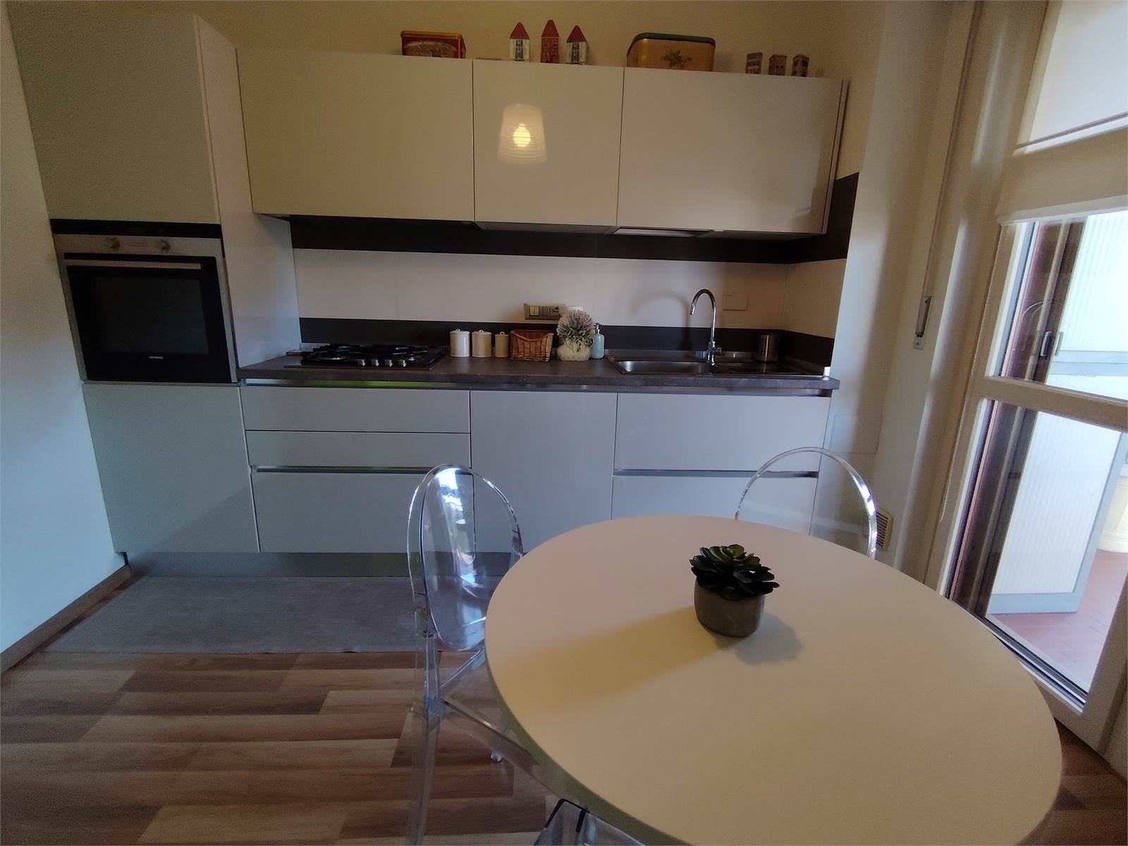 L'ingresso, che avviene tramite porta blindata, è direttamente sull'ampio soggiorno, molto luminoso grazie a finestra e porta finestra; quest'ultima introduce al terrazzino. Attigua si trova la cucina abitabile, anch'essa con porta finestra che conduce al terrazzo di cui sopra. Le camere da letto sono due; una singola con affaccio su un balcone e l'altra matrimoniale con finestra. I bagni ciechi sono due. Vi è inoltre un pratico e sempre utile ripostiglio. Il riscaldamento è autonomo con caldaia a condensazione. Gli infissi esterni sono in PVC con doppio vetro, tinta legno la parte esterna e color bianco quella interna; dispongono anche di zanzariere e di tapparelle metalliche. L'appartamento è completo di impianto di condizionamento che funziona anche come pompa di calore e di antifurto sia volumetrico che perimetrale. Elemento da evidenziare è lo splendido affaccio panoramico sull'arco alpino che si gode dal terrazzino, completo di tende da sole, sfruttabile ad esempio per organizzare cene all'aperto con gli amici o per godersi il relax della zona.