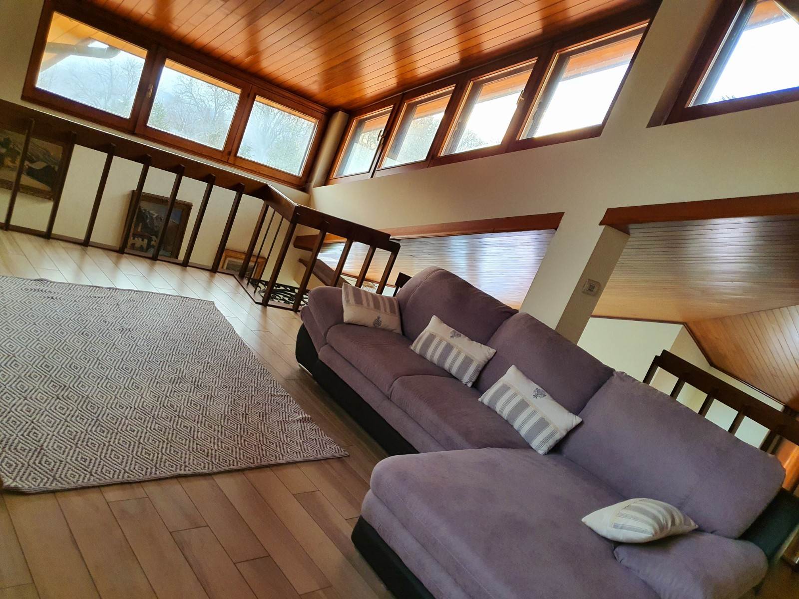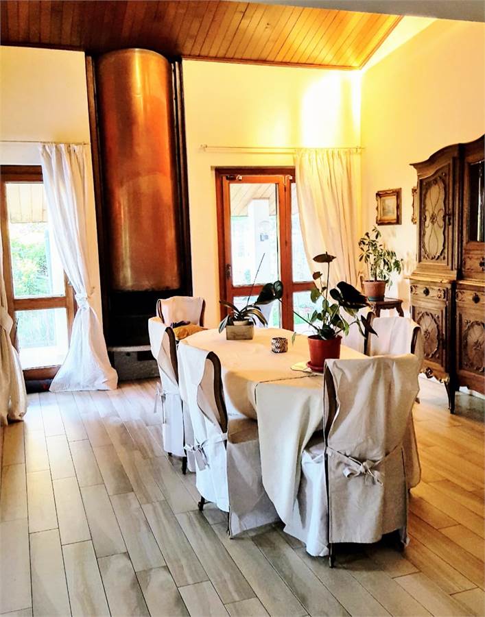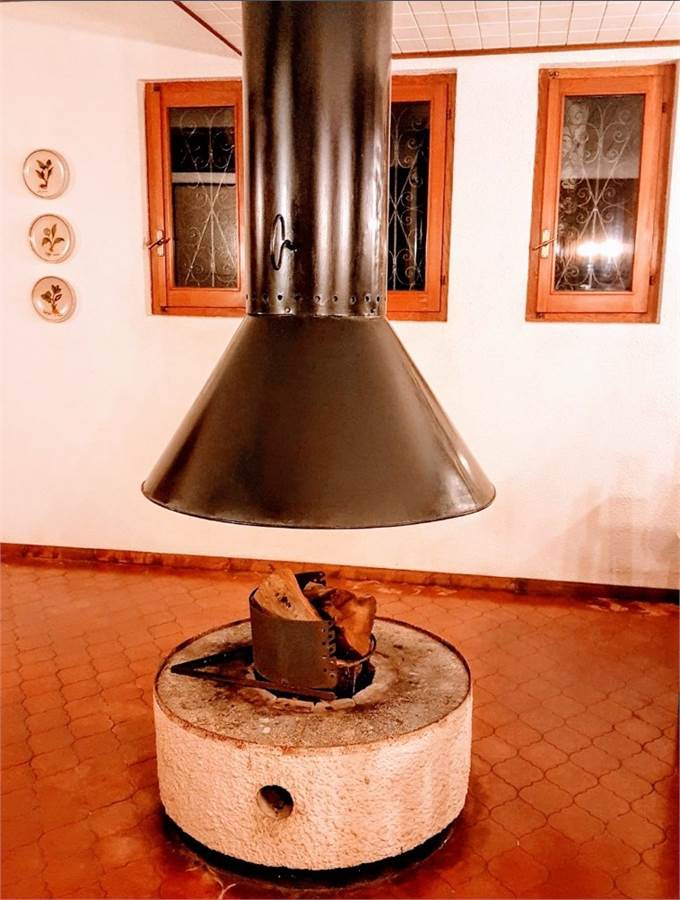 Varcando l’ingresso, si viene accolti da un salone doppio caldo e luminoso, dove il caminetto diventa il cuore della casa e le ampie vetrate a tutta altezza accompagnano la luce naturale durante l’arco della giornata, regalando scorci sempre diversi sul paesaggio circostante.
