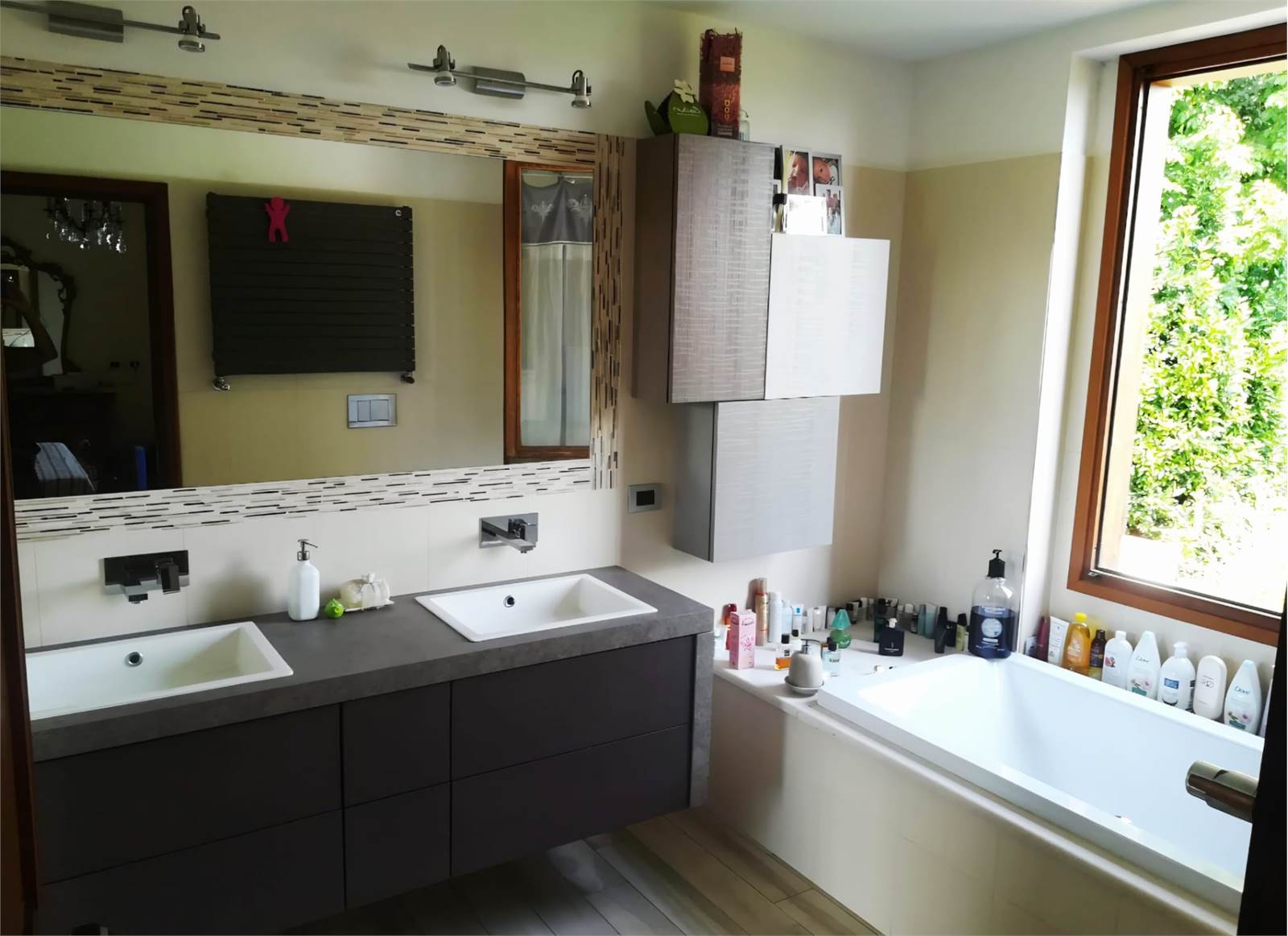 Il piano seminterrato, finestrato e luminoso, amplia ulteriormente le possibilità della casa, ospitando una taverna con camino, un vano aggiuntivo con bagno e lavanderia, perfetto come spazio di servizio, area hobby o ambiente dedicato al tempo libero.